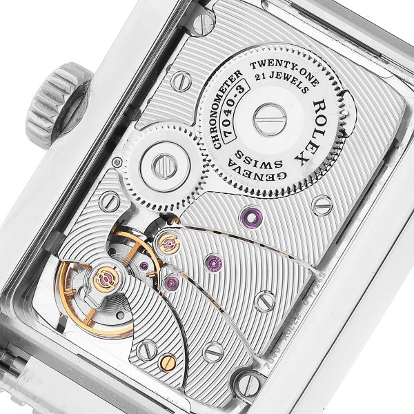 | Case: | 18k white gold case 28 x 47 mm. Rolex logo on the crown. Exhibition sapphire case back. |