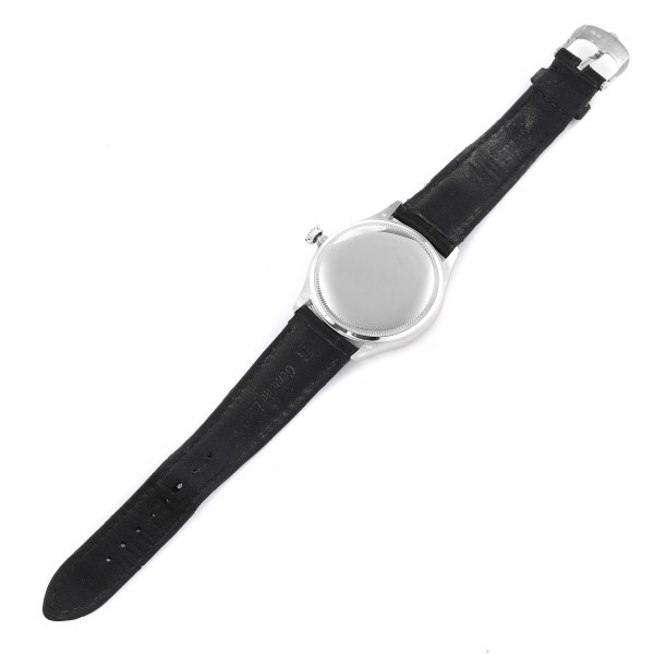 | Bracelet: | Custom black leather strap with 18K white gold tang buckle. |
