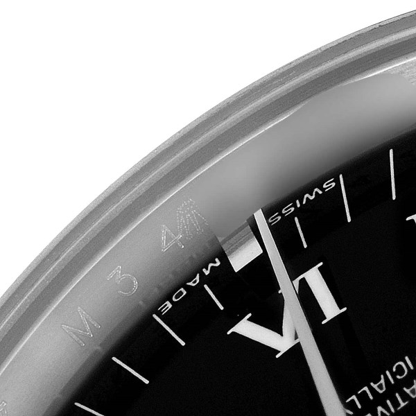 | Dial: | Black dial with roman numerals. Minute markers around the outer rim. Date window at 3 o'clock aperture. |