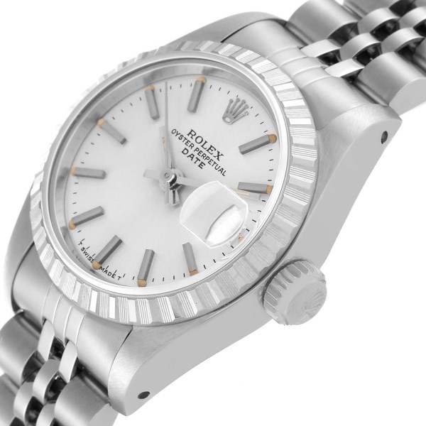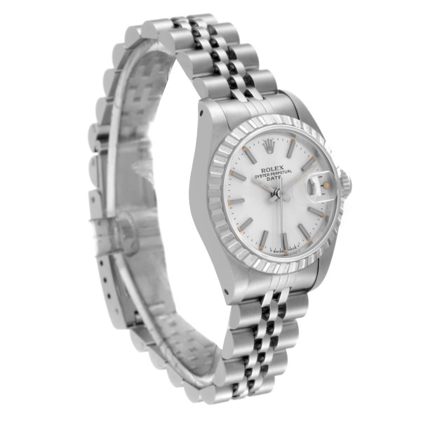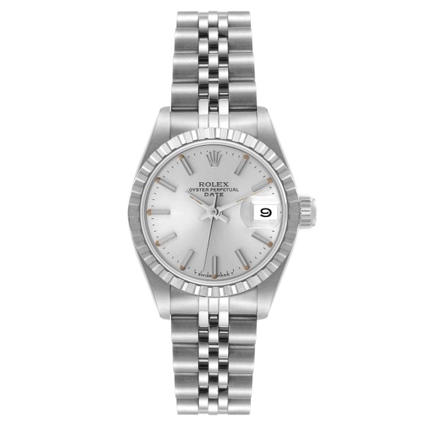 | Model Name: | Rolex Date Steel Silver Dial Engine Turned Bezel Ladies Watch 69240 |