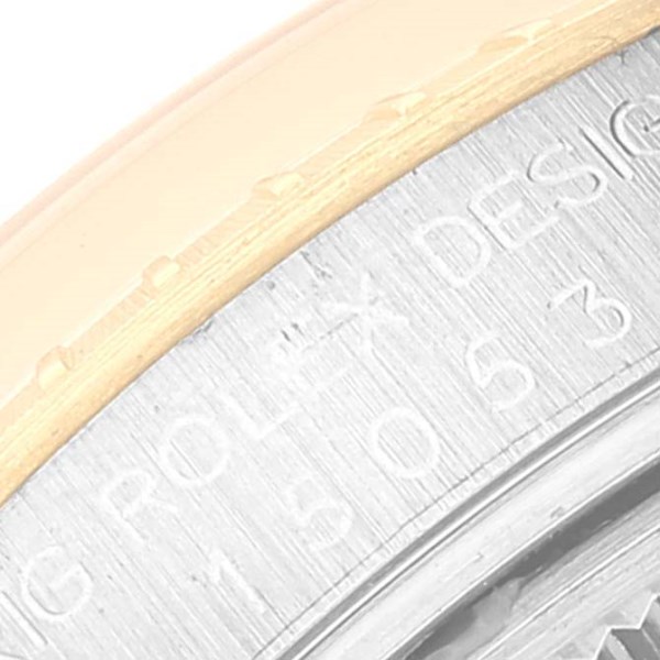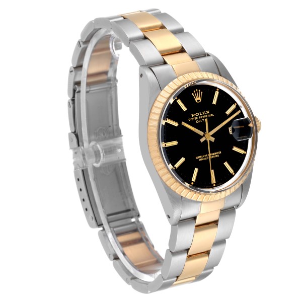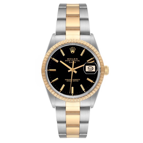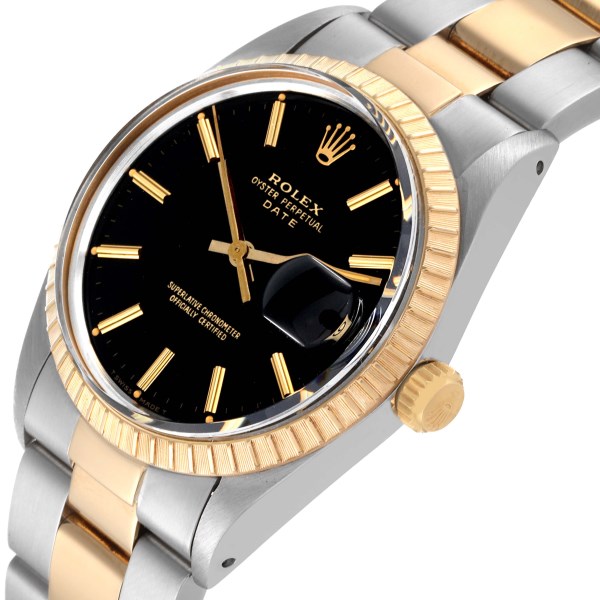 | Model Name: | Rolex Date Steel Yellow Gold Engine Turned Bezel Black Dial Mens Watch 15053 |