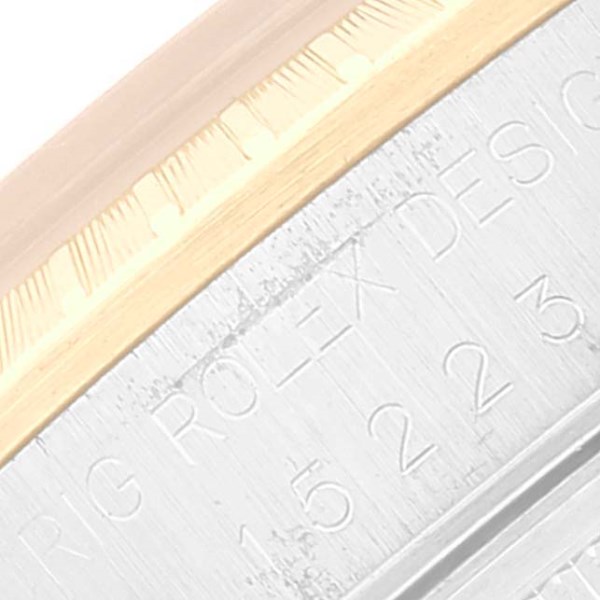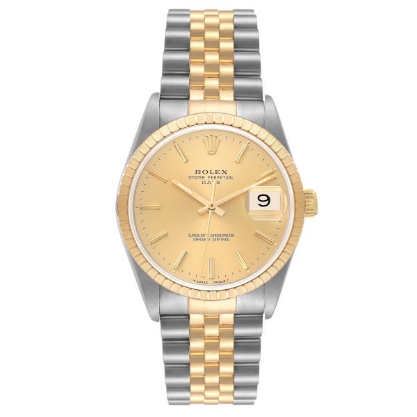 | Model Name: | Rolex Date Steel Yellow Gold Engine Turned Bezel Champagne Dial Mens Watch 15223 |