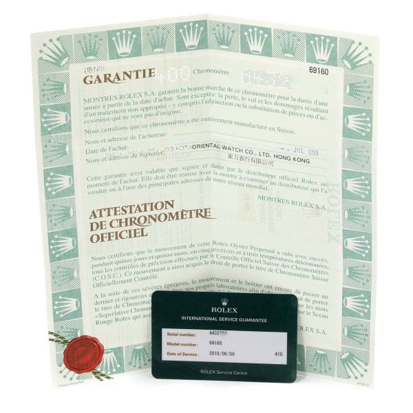 | Box & Papers: | Rolex papers, service card, presentation non-Rolex box. |