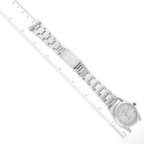 | Dial: | Silver dial with raised Roman numerals. Date window at 3 o'clock aperture. |