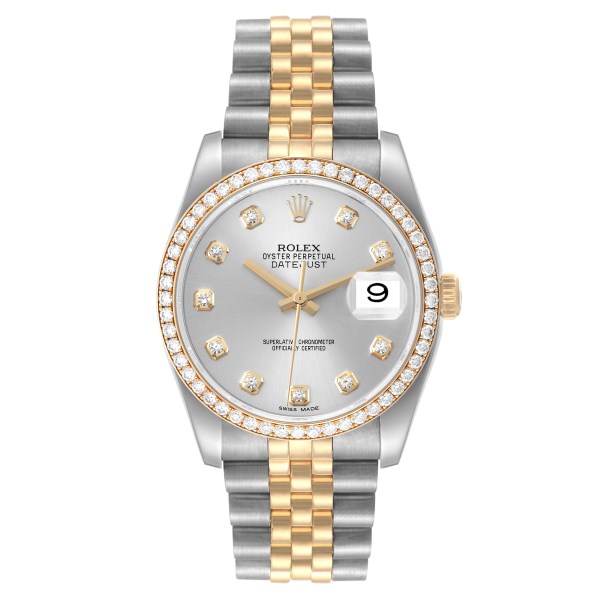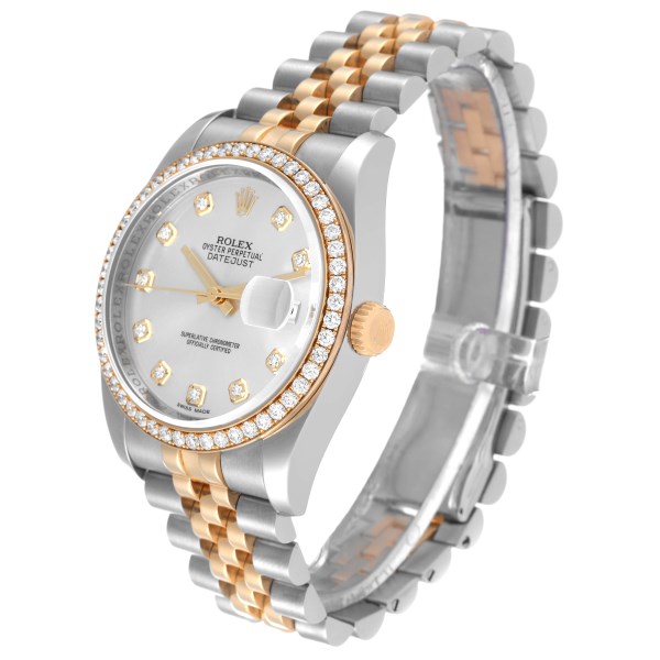 | Model Name: | Rolex Datejust 36 Steel Yellow Gold Silver Dial Diamond Bezel Mens Watch 116243 |