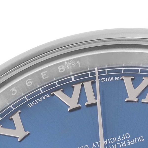 | Dial: | Blue dial with luminous hands and raised Roman numerals. Minute markers around the outer rim. Date window at 3 o'clock aperture. |