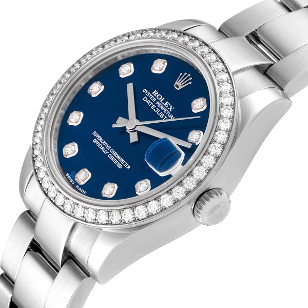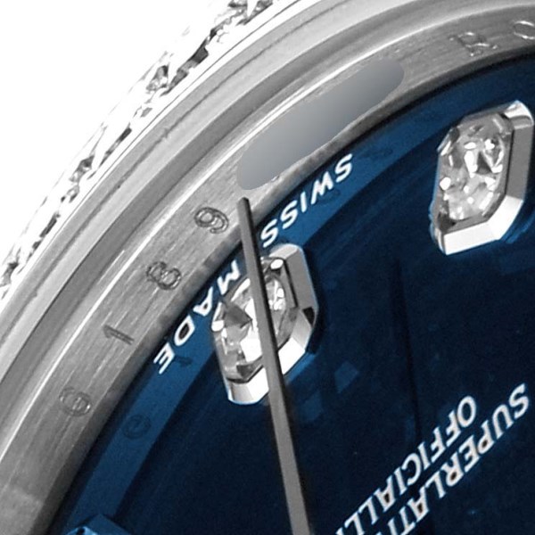 | Dial: | Blue dial with original Rolex factory diamond hour markers. Date calendar at 3 o'clock aperture. |