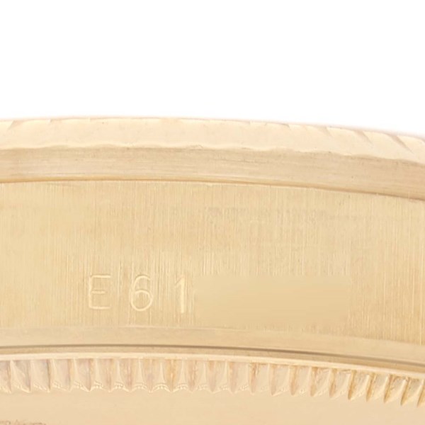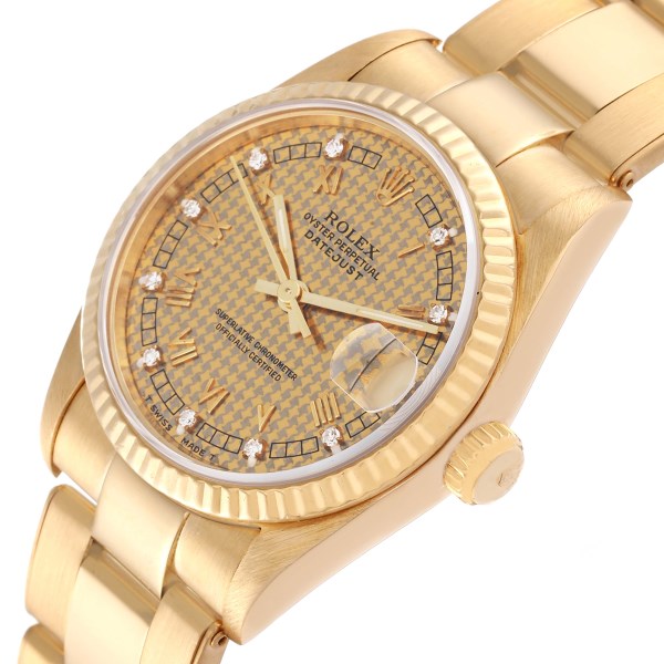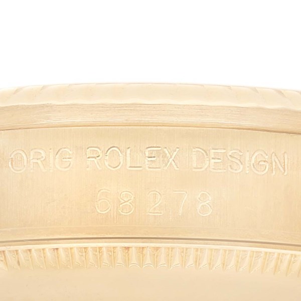 | Dial: | Houndstooth dial with yellow gold Roman numerals and original Rolex factory diamonds. Date calendar at 3 o'clock aperture. |