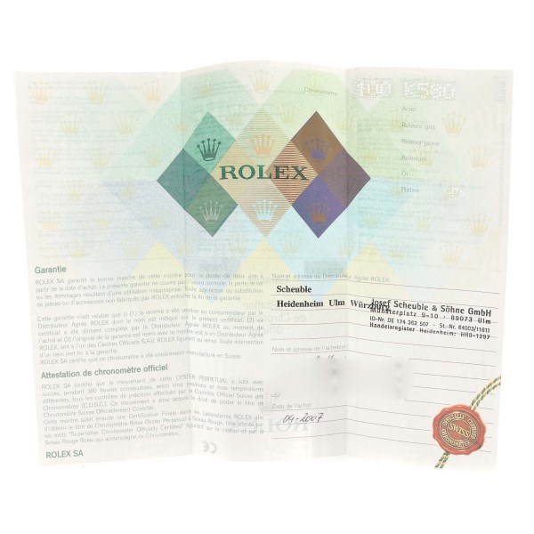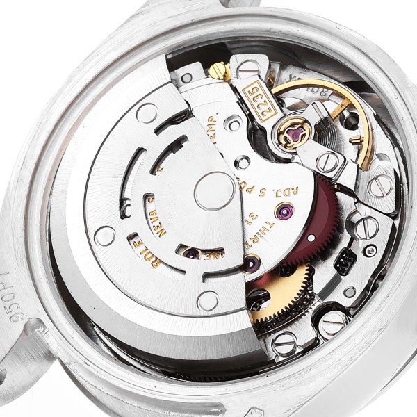 | Case: | Platinum oyster case 26.0 mm in diameter. Rolex logo on the crown. Lugs set with original Rolex factory diamonds. |