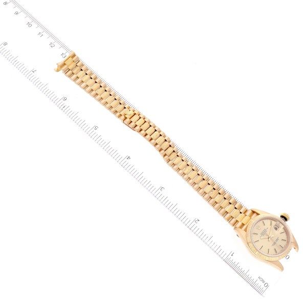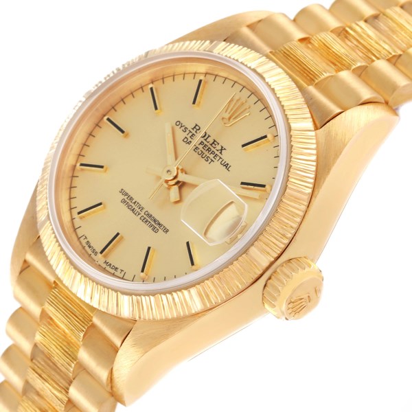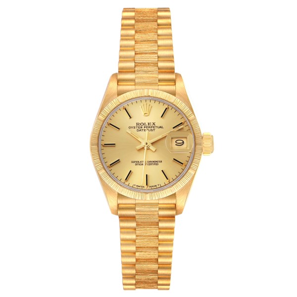 | Model Name: | Rolex Datejust President Yellow Gold Bark Finish Ladies Watch 69278 Box Papers |
