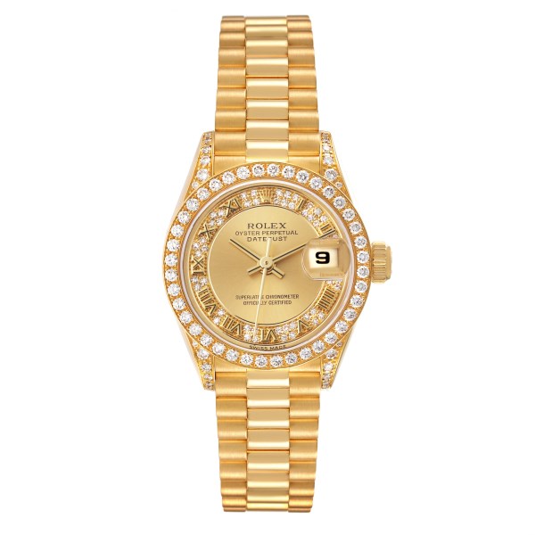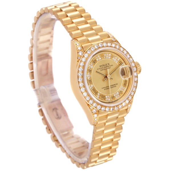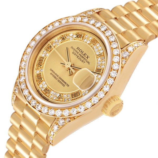 | Model Name: | Rolex Datejust President Yellow Gold Myriad Dial Diamond Bezel Ladies Watch 69158 |