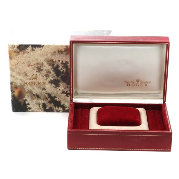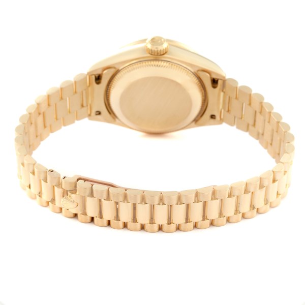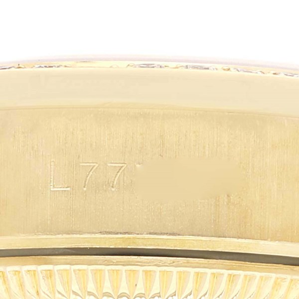 | Case: | 18k yellow gold oyster case 26.0 mm in diameter. Lugs set with original Rolex factory diamonds. Rolex coronet logo on the crown. |