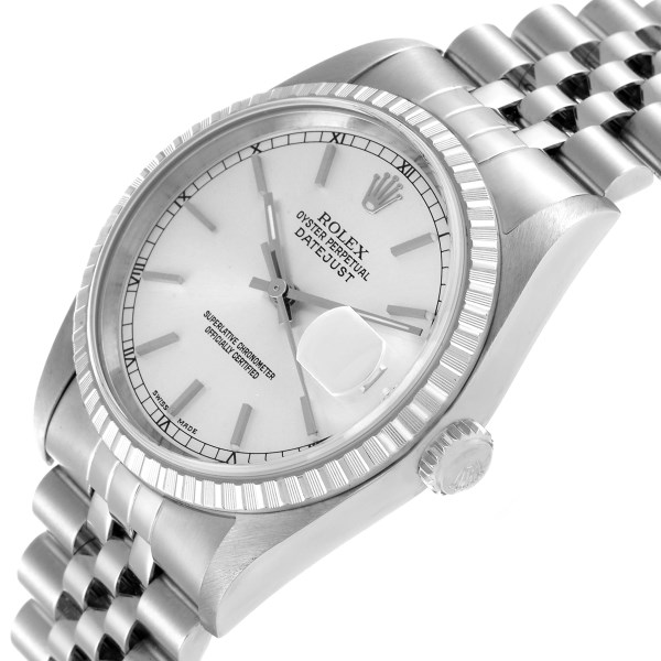 | Model Name: | Rolex Datejust Silver Dial Engine Turned Bezel Steel Mens Watch 16220 |