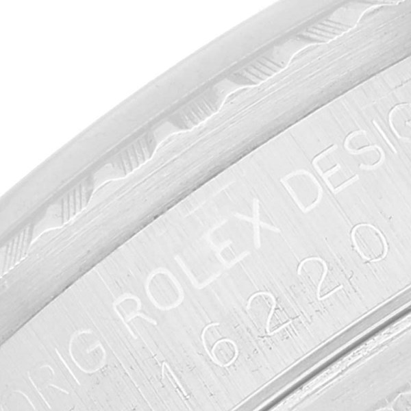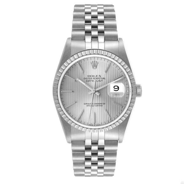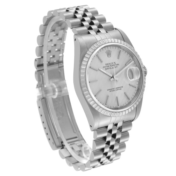 | Model Name: | Rolex Datejust Silver Tapestry Dial Engine Turned Bezel Steel Mens Watch 16220 |