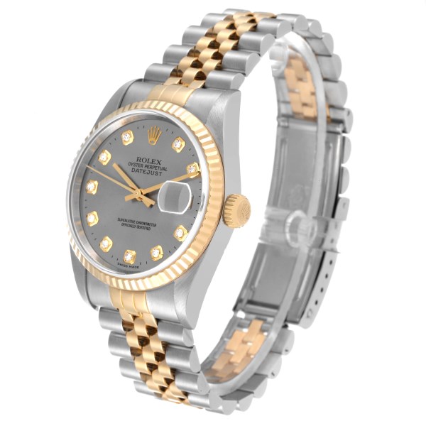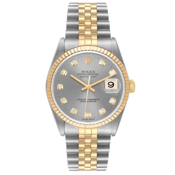 | Dial: | Slate grey dial with original Rolex factory diamond hour markers. Date window at 3 o'clock aperture. |