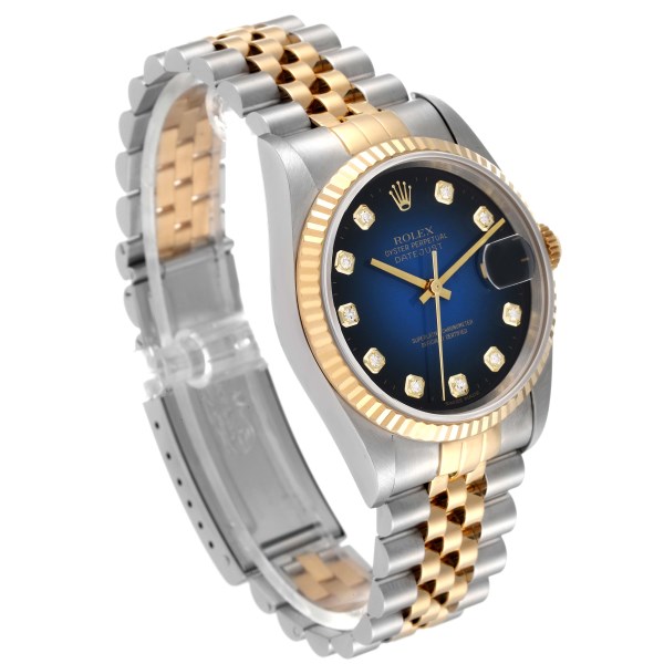 | Dial: | Blue vignette dial with original Rolex factory diamond hour markers. Date window at 3 o'clock aperture. |