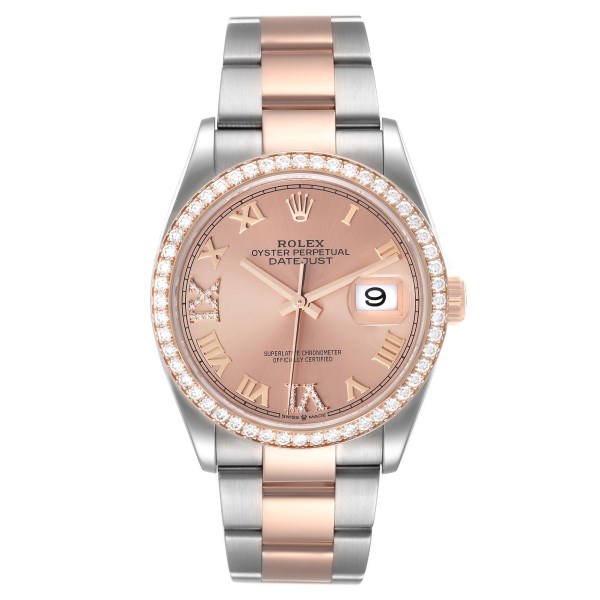 | Dial: | Rose dial with rose gold roman numerals. Original Rolex factory diamond roman numerals at 6 and 9. Date window at 3 o'clock aperture. |