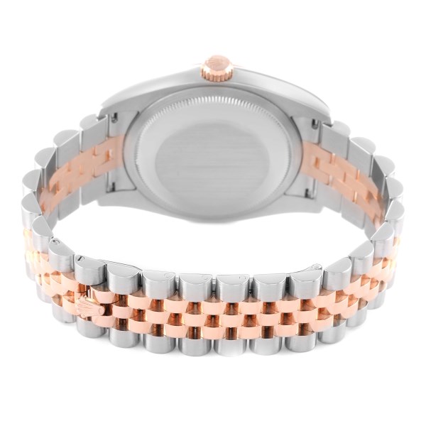 | Case: | Stainless steel case 36 mm in diameter. Rolex logo on an 18K Everose gold crown. |
