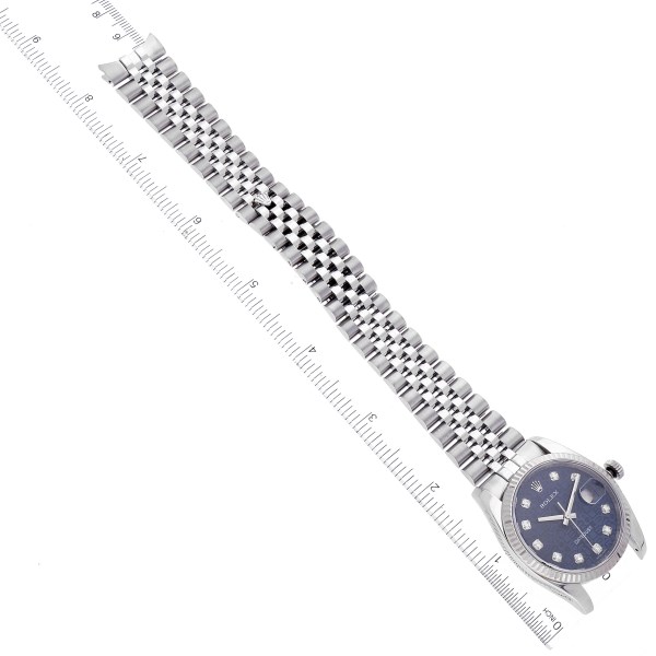 | Dial: | Blue jubilee anniversary dial with original Rolex factory diamond markers. Date window at 3 o'clock aperture. |