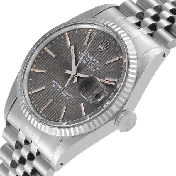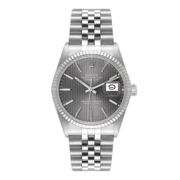 | Model Name: | Rolex Datejust Steel White Gold Grey Tapestry Dial Vintage Mens Watch 16014 Box Papers |