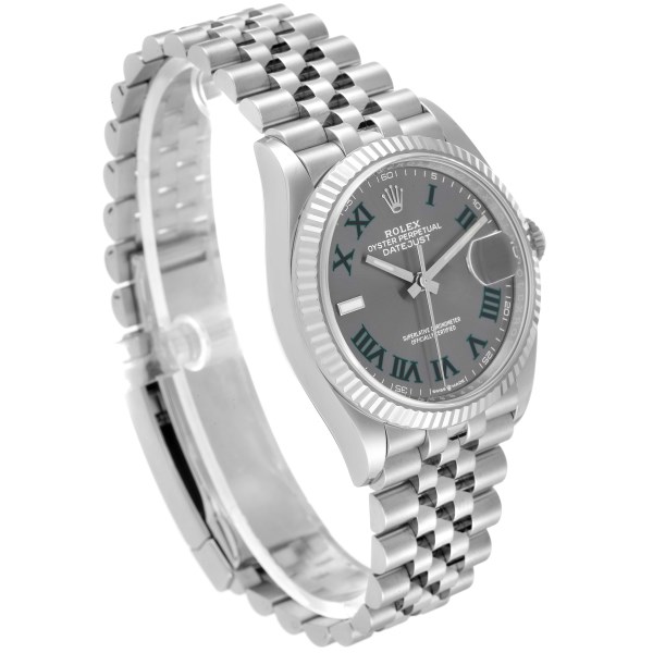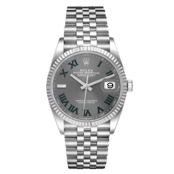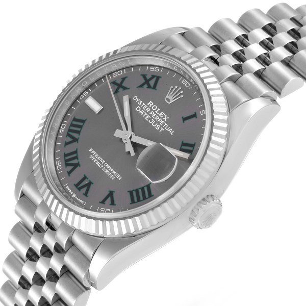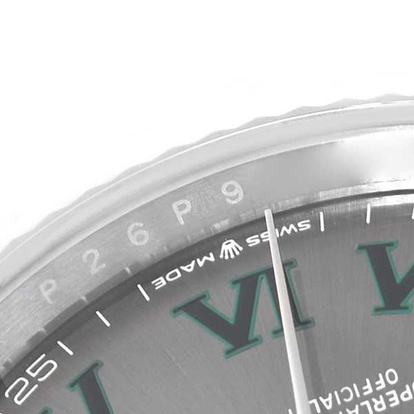 | Dial: | Grey Wimbledon dial with green roman numerals. Date window at 3 o'clock aperture. |