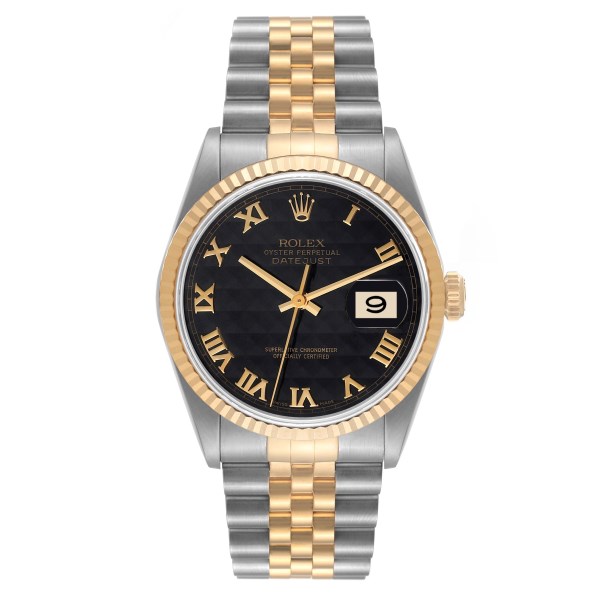 | Model Name: | Rolex Datejust Steel Yellow Gold Black Pyramid Dial Mens Watch 16233 |