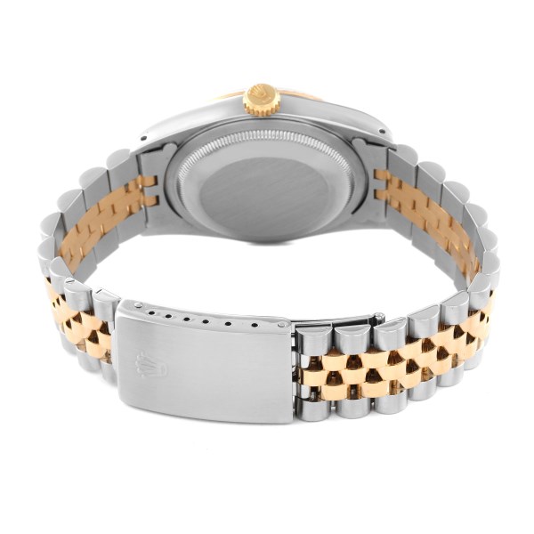 | Case: | Stainless steel case 36.0 mm in diameter. Rolex logo on an 18K yellow gold crown. |
