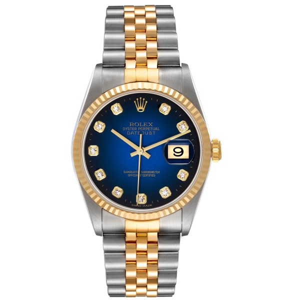 | Model Name: | Rolex Datejust Steel Yellow Gold Blue Vignette Diamond Dial Mens Watch 16233 |