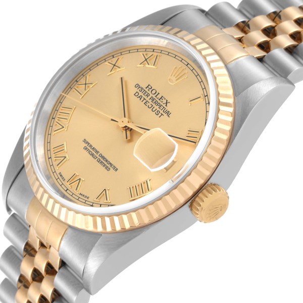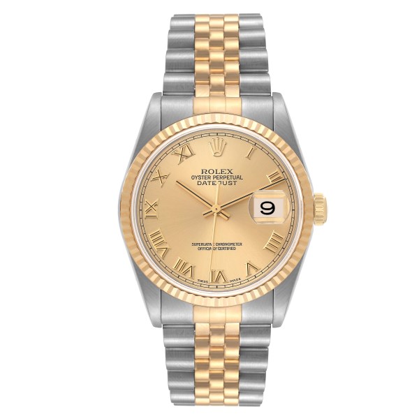 | Model Name: | Rolex Datejust Steel Yellow Gold Champagne Roman Dial Mens Watch 16233 |
