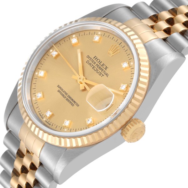 | Model Name: | Rolex Datejust Steel Yellow Gold Diamond Dial Mens Watch 16233 Box Papers |