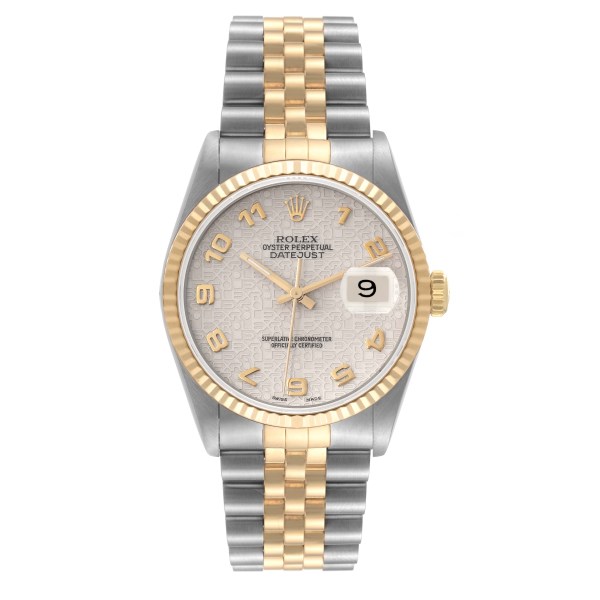 | Model Name: | Rolex Datejust Steel Yellow Gold Ivory Anniversary Dial Watch 16233 Box Papers |