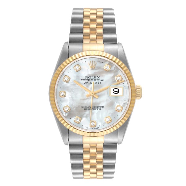 | Model Name: | Rolex Datejust Steel Yellow Gold Mother of Pearl Diamond Dial Mens Watch 16233 |