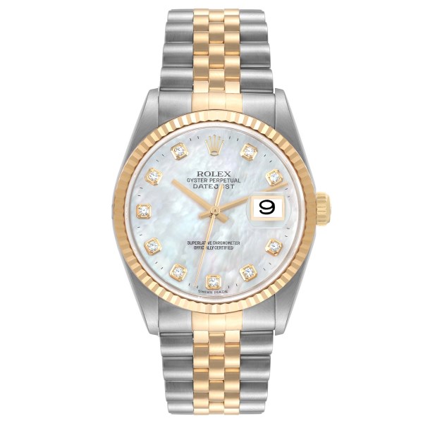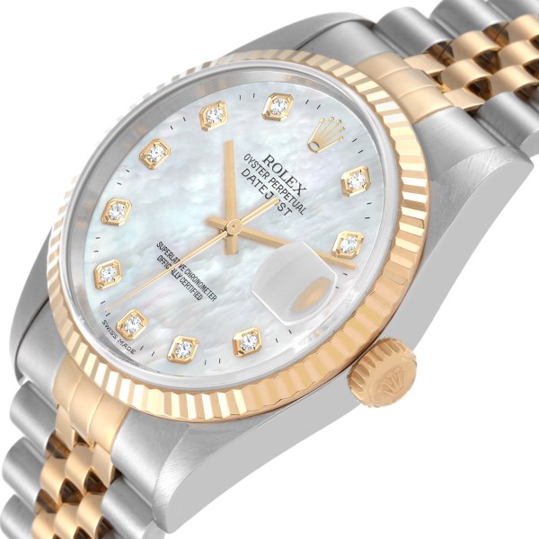 | Model Name: | Rolex Datejust Steel Yellow Gold Mother of Pearl Diamond Mens Watch 16233 Box Papers |
