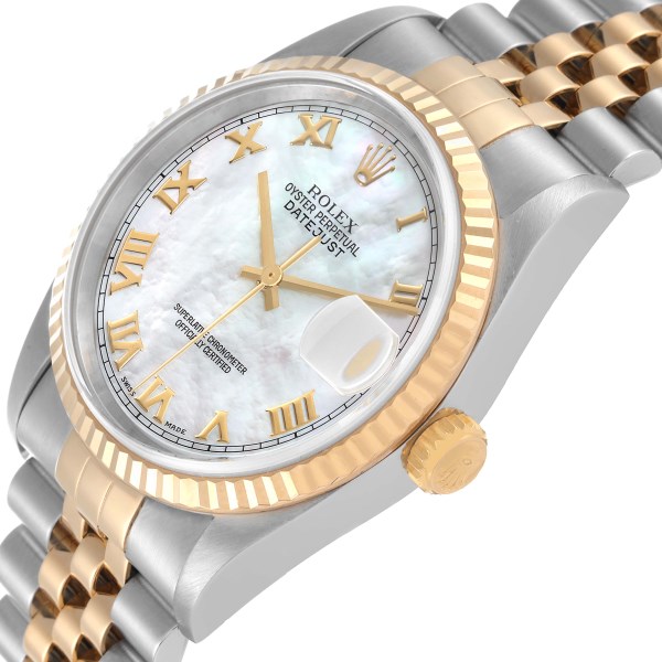 | Model Name: | Rolex Datejust Steel Yellow Gold Mother of Pearl Roman Dial Mens Watch 16233 |