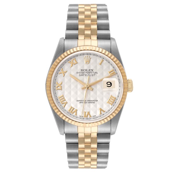 | Model Name: | Rolex Datejust Steel Yellow Gold Pyramid Dial Mens Watch 16233 Box Papers |