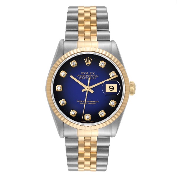 | Dial: | Blue vignette dial with original Rolex factory diamond hour markers. Date window at 3 o'clock aperture. |