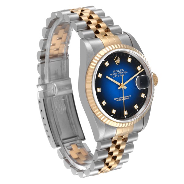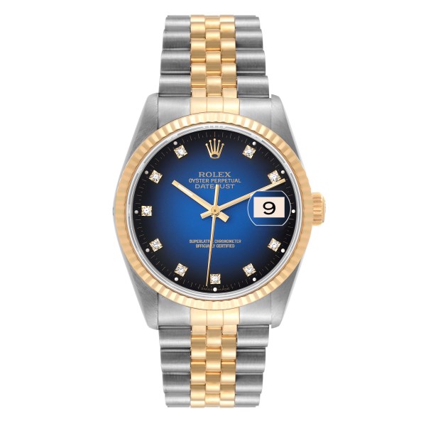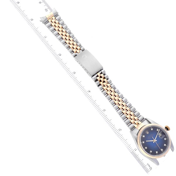 | Dial: | Blue vignette dial with original Rolex factory diamond hour markers. Date window at 3 o'clock aperture. |