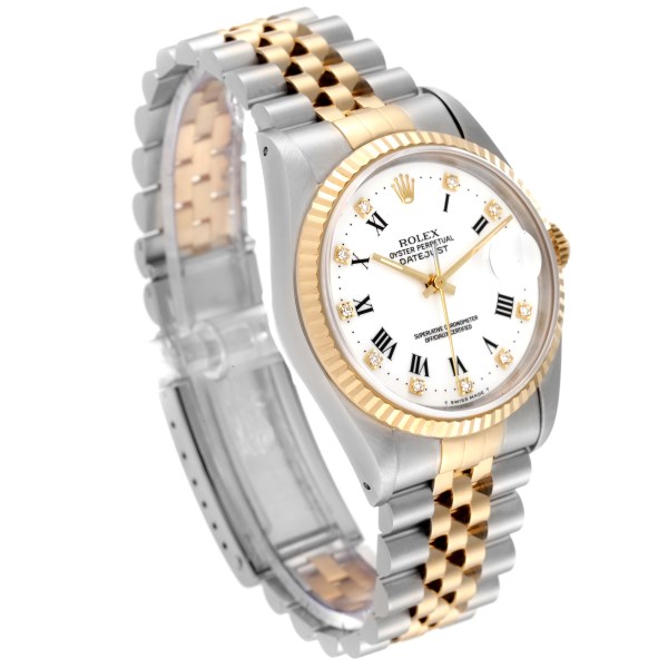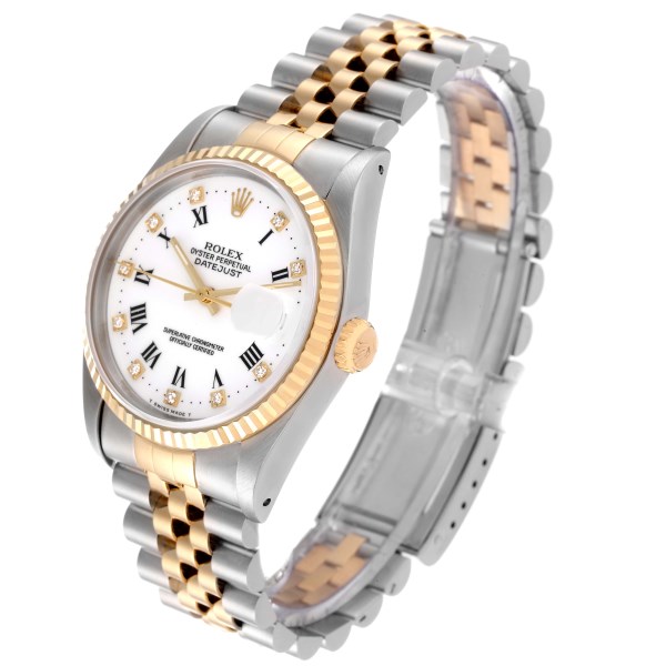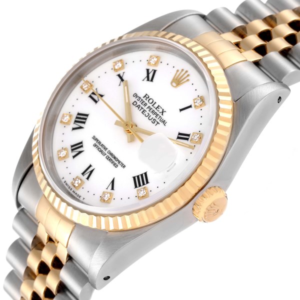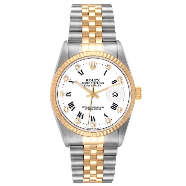 | Model Name: | Rolex Datejust Steel Yellow Gold White Diamond Dial Mens Watch 16233 Box Papers |