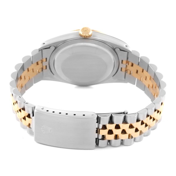 | Case: | Stainless steel case 36 mm in diameter. Rolex logo on an 18K yellow gold crown. |
