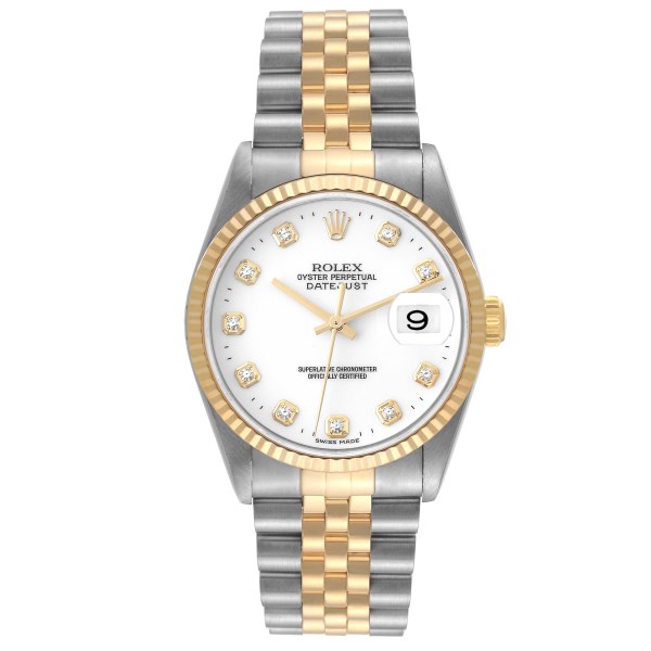 | Model Name: | Rolex Datejust Steel Yellow Gold White Diamond Dial Mens Watch 16233 |