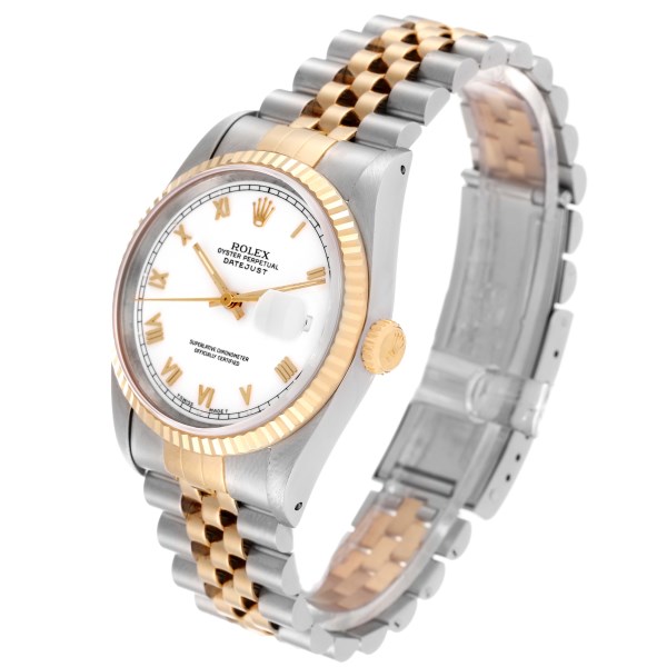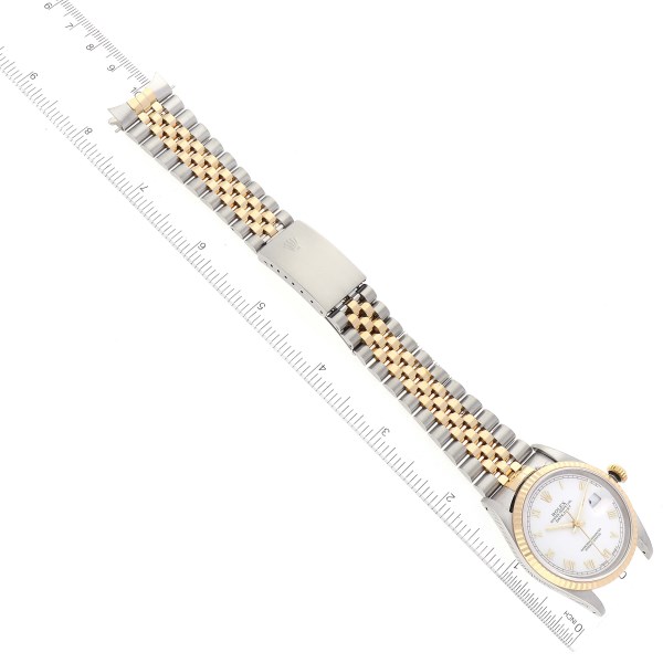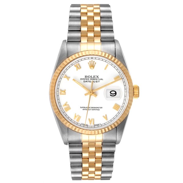 | Model Name: | Rolex Datejust Steel Yellow Gold White Roman Dial Mens Watch 16233 Box Papers |