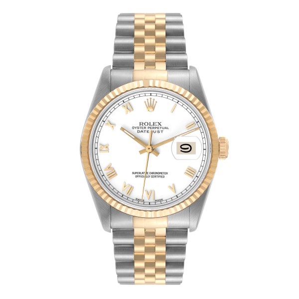 | Model Name: | Rolex Datejust Steel Yellow Gold White Roman Dial Mens Watch 16233 |