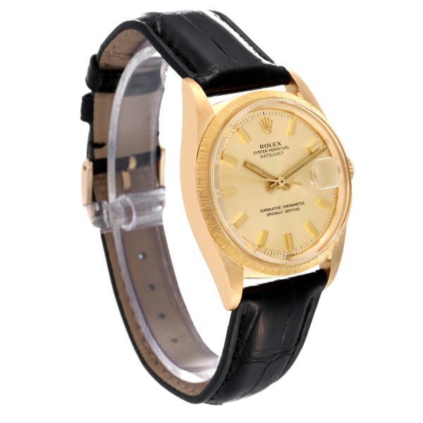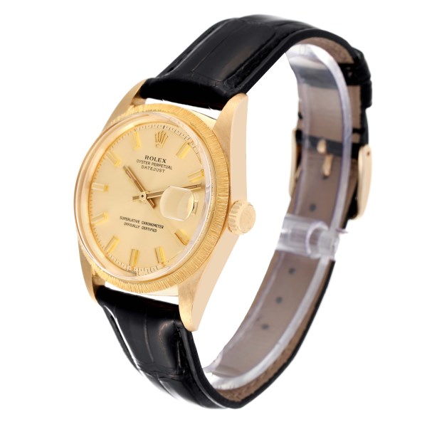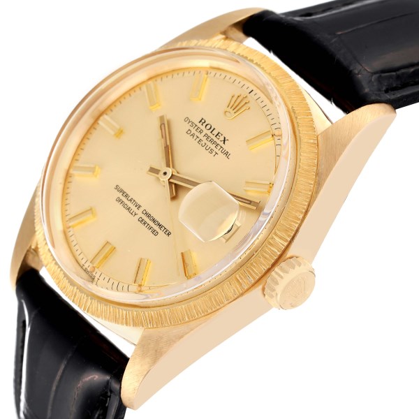 | Model Name: | Rolex Datejust Yellow Gold Bark Finish Wide Boy Dial Vintage Mens Watch 1607 |