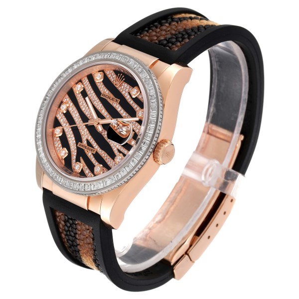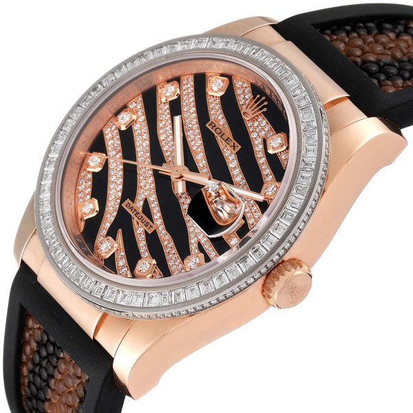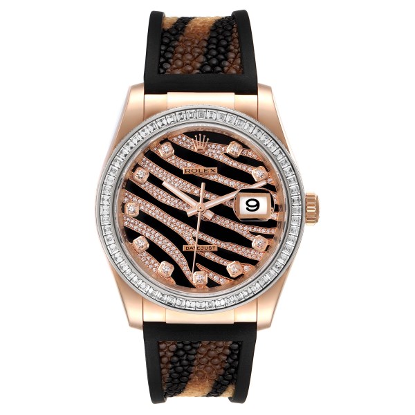 | Model Name: | Rolex Datejust Zebra Pave Diamond Dial Rose Gold Mens Watch 116185 |