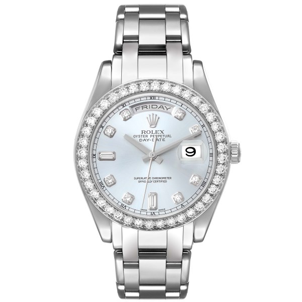 | Model Name: | Rolex Day-Date Masterpiece Platinum Ice Blue Diamond Watch 18946 Box Papers |