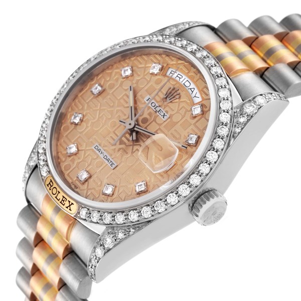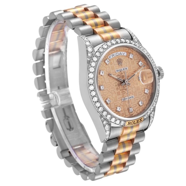 | Model Name: | Rolex Day-Date President Tridor White Rose Yellow Gold Diamond Mens Watch 18139 |