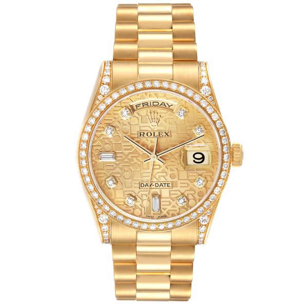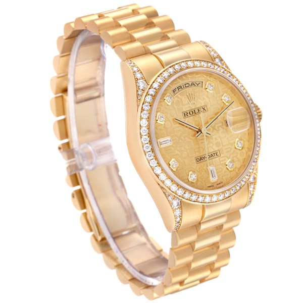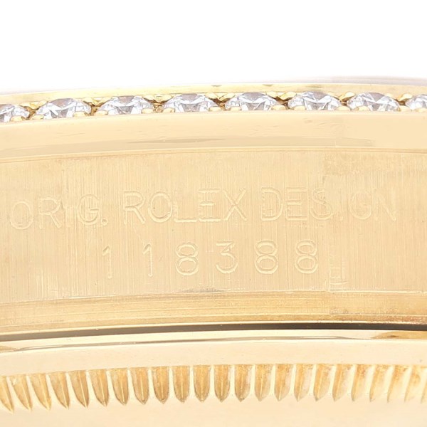 | Model Name: | Rolex Day-Date President Yellow Gold Diamond Bezel Mens Watch 118388 |