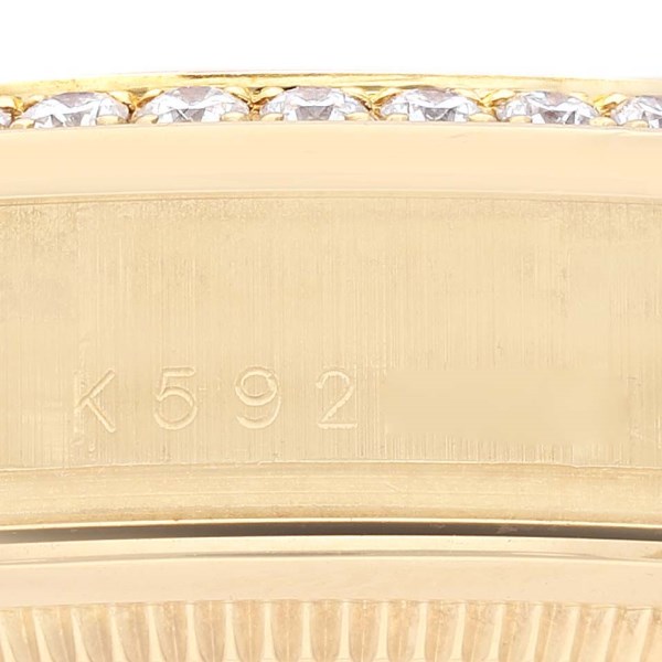 | Case: | 18k yellow gold oyster case 36.0 mm in diameter. Rolex logo on the crown. Lugs are set with original Rolex factory diamonds. |