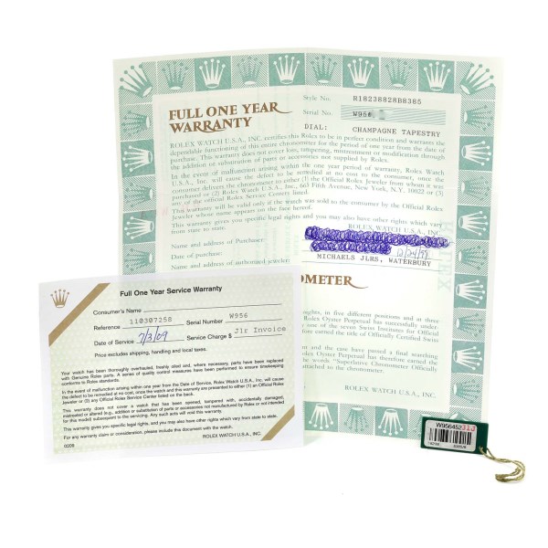 | Dial: | Champagne tapestry dial with raised gold baton hour markers. Aperture for day at 12, aperture for date at 3. |
