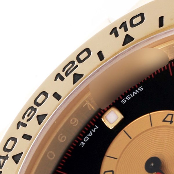 | Bezel: | 18K yellow gold tachymeter engraved bezel. |
